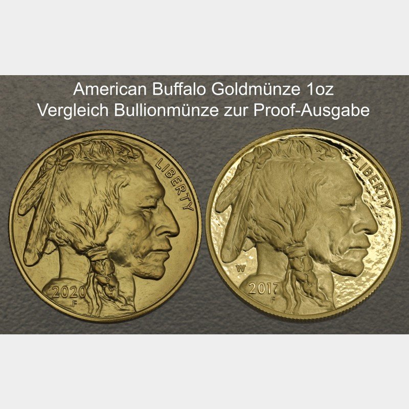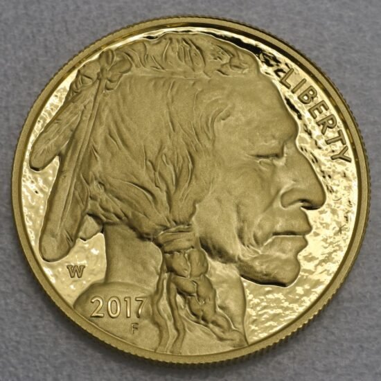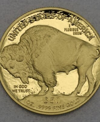 Seit 2006 prägt die United States Mint die 1oz American Buffalo PP Goldmünze, ein Anlageklassiker in Polierter Platte (PP). Mit einem Feingehalt von 999,9/1000 (24-Karat-Gold) und einem Gewicht von 1 Feinunze (31,1g) zeigt sie ein ikonisches Design. Folglich ziert die Zahlseite ein nordamerikanischer Büffel auf einem Hügel, inspiriert von der 1913er 5-Cent-Münze. Zudem trägt die Proof-Variante den Buchstaben „W“ für West Point Mint unter dem Büffel. Die Kopfseite zeigt ein Indianer-Porträt, ebenfalls aus 1913, mit detailliertem Federschmuck. Außerdem umfasst die Umschrift „UNITED STATES OF AMERICA“, „$50“, und „1 OZ. FINE GOLD“.