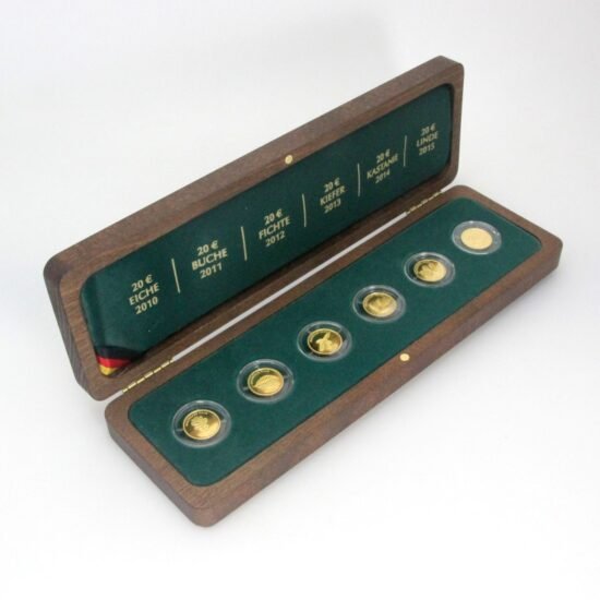 Das 6x 20 Euro “Deutscher Wald” Goldmünzen Set (2010-2015) ist ein exklusives Sammler- und Investmentpaket für Liebhaber hochwertiger deutscher Goldmünzen. Dieses Komplettset umfasst sechs 1/4-Unzen-Goldmünzen (insgesamt 1,5 Feinunzen, 46,65g) mit einem Feingehalt von 999,9/1000, geprägt von der Bundesrepublik Deutschland. Enthalten sind die Münzen: 2010 Eiche, 2011 Buche, 2012 Fichte, 2013 Kiefer, 2014 Kastanie und 2015 Linde. Angeboten von UCTR-GmbH, stammt das Set aus dem Ankauf und wird in der Original-Sammelbox geliefert, die leichte Gebrauchsspuren aufweisen kann. Jede Münze wird auf Echtheit und Feingehalt geprüft, ohne Einzelzertifikate. Prägebuchstabenwünsche können nicht erfüllt werden, da die Zuteilung nach Verfügbarkeit erfolgt.